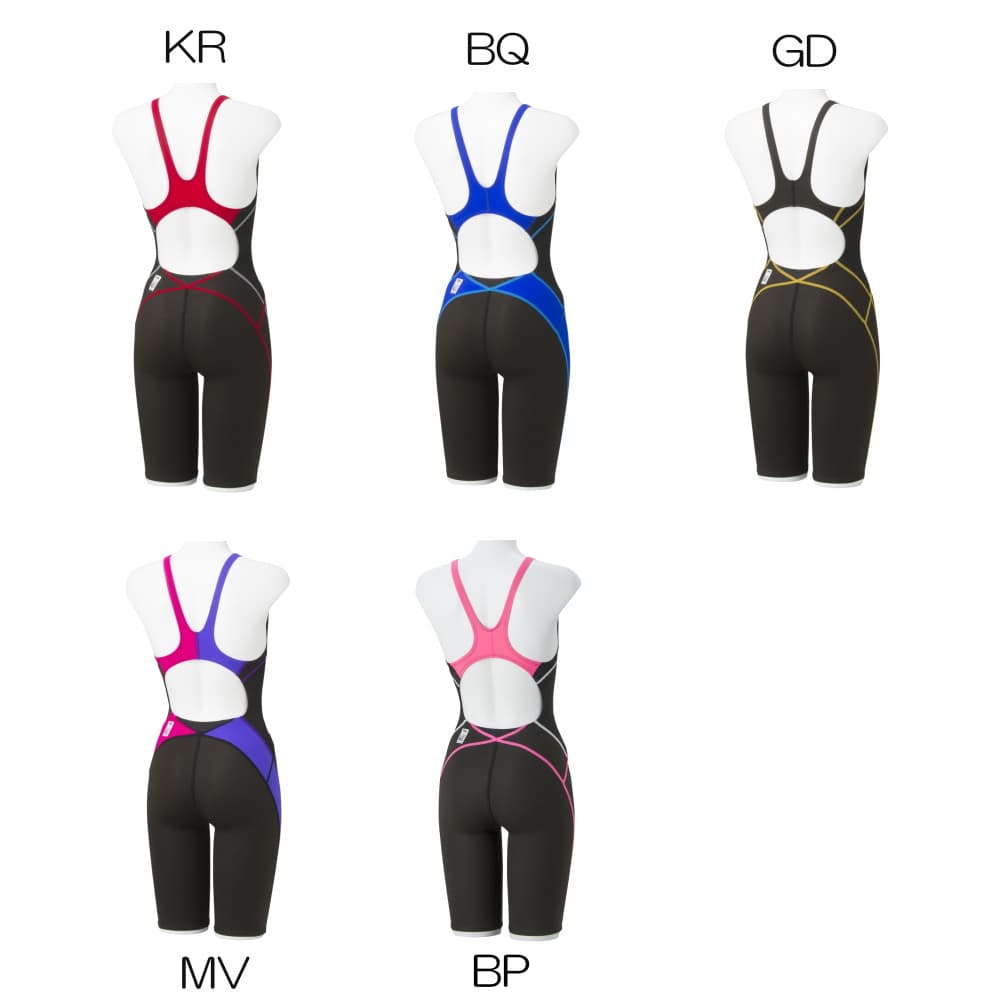 【背面形状:オープンバック】 【パッドフック受け付き】 【股下:4分丈】 商品特徴 【FINA承認モデル】 カラーバリエーション KR:ブラック×レッド BQ:ブルー×ターコイズ GD:ゴールド MV:マジェンタ×ヴァイオレット BP:ブレイズピンク(2018年S2モデル新色) 初めて競泳水着をお求めの方へ 競泳水着は「速く泳ぐ事」を最大のテーマに設計されております。